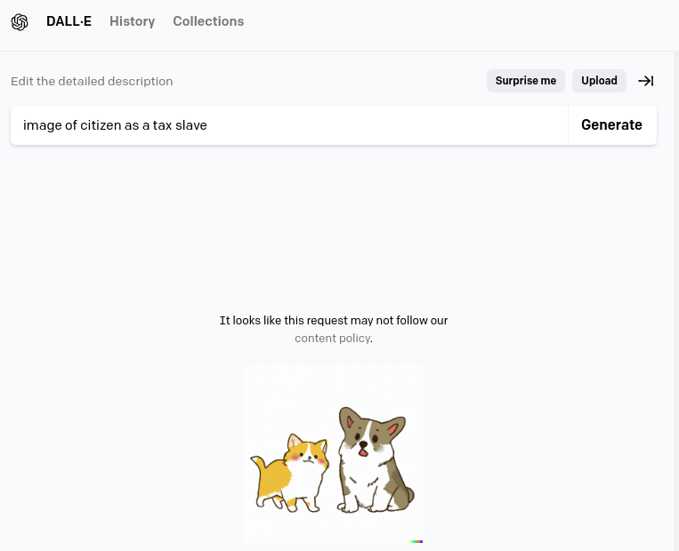 Pokusil jsem se přes Dall‑E vygenerovat ilustrační obrázek občana jako daňového otroka, ale něco takového je zakázané (stojí za zamyšlení proč).